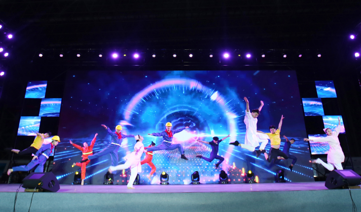 演出在大型舞蹈《我們都是追夢人》中拉開序幕。深中通道建設(shè)者帶來了詩朗誦《鑄夢深中》,展現(xiàn)了中交人 “交融天下,建者無疆”的胸襟與魄力,女子群舞《青花瓷韻》傳遞了中國傳統(tǒng)藝術(shù)之美,歌曲三重奏《加油干》令現(xiàn)場氛圍火爆,肩上芭蕾《東方天鵝》以其高難度的技巧和絕美的藝術(shù)表現(xiàn)博得了在場觀眾的陣陣喝彩,獨唱《幸福中國一起走》展示了廣東日新月異的發(fā)展變化,相聲《談大論小》在贊美深中通道這一重大工程之余也提醒建設(shè)者要時刻注意安全防護,女子群舞《雨打芭蕉》讓觀眾的身心得到了放松,抗疫歌曲《少年》和《隔不斷的愛》深深打動了在場觀眾,激勵建設(shè)者不忘初心、珍惜家人。