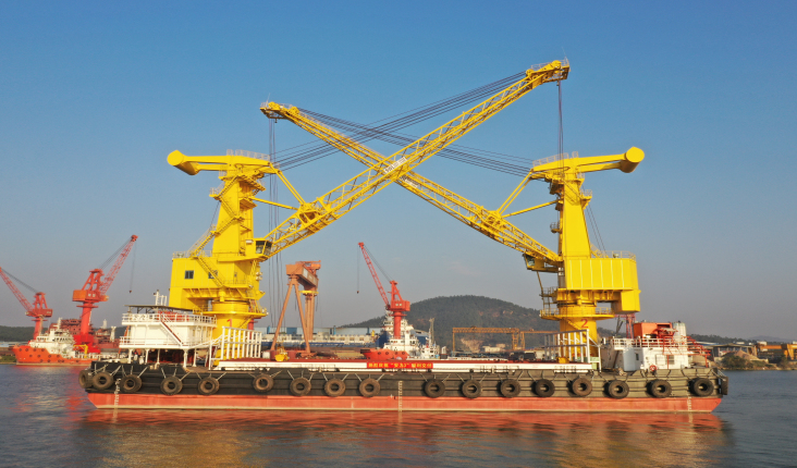 不同于以往建造的同類型吊駁,為方便船舶長期靠泊碼頭的維護與保養(yǎng),該船首次采用固定式門座吊機。船艏尾分別設置一臺50T/45M門座式吊機,以轉(zhuǎn)運集裝箱為主。吊機吊臂轉(zhuǎn)軸距離主甲板高度約為13米,可在貨倉內(nèi)堆滿4層集裝箱。面對這個重量級選手,建造團隊攻克了穩(wěn)性吃水等設計問題,同時以高水平的吊裝施工能力成功完成兩臺門座式吊機的吊裝。