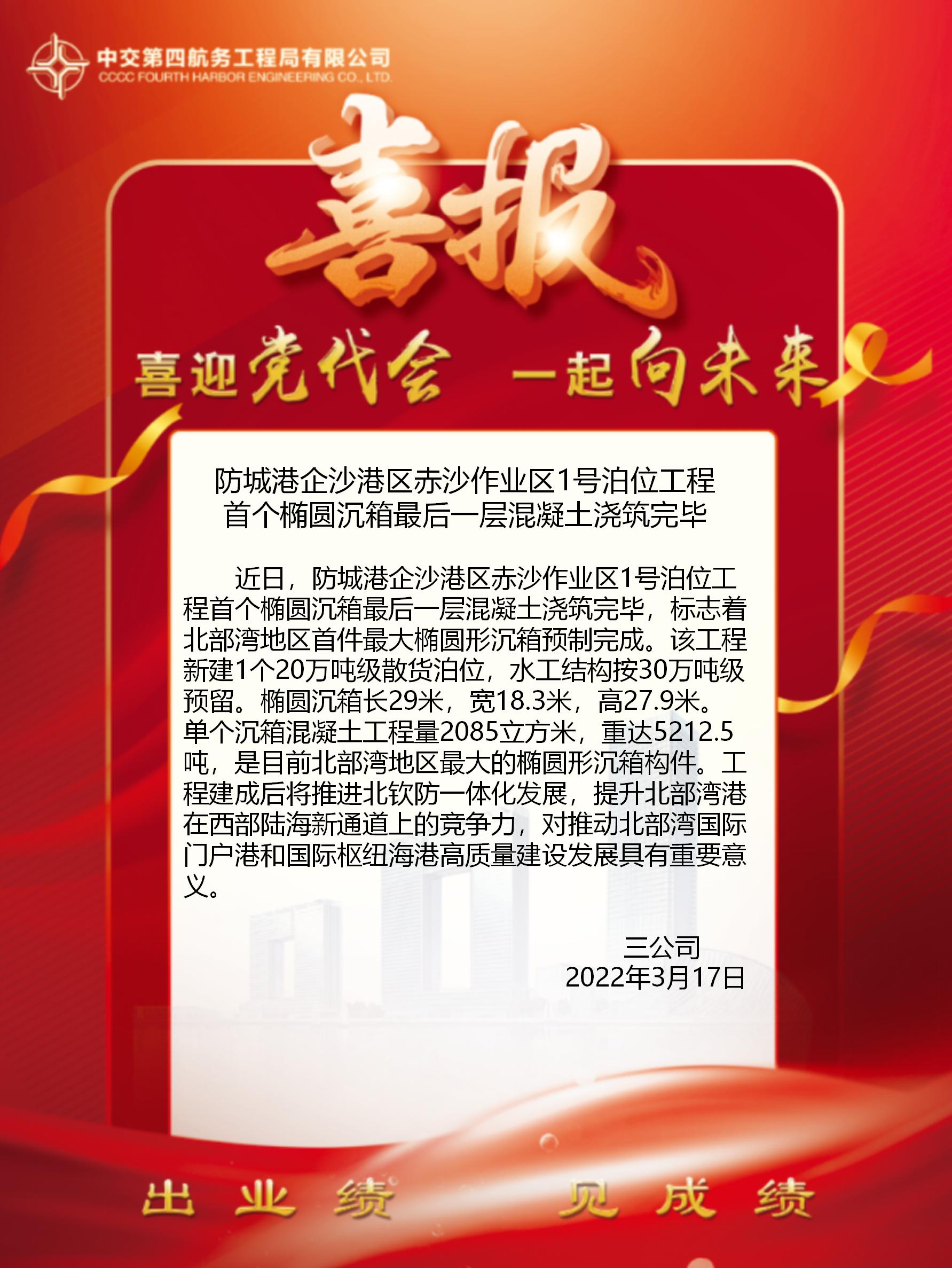 防城港企沙港區(qū)赤沙作業(yè)區(qū)1號泊位工程 首個(gè)橢圓沉箱最后一層混凝土澆筑完畢