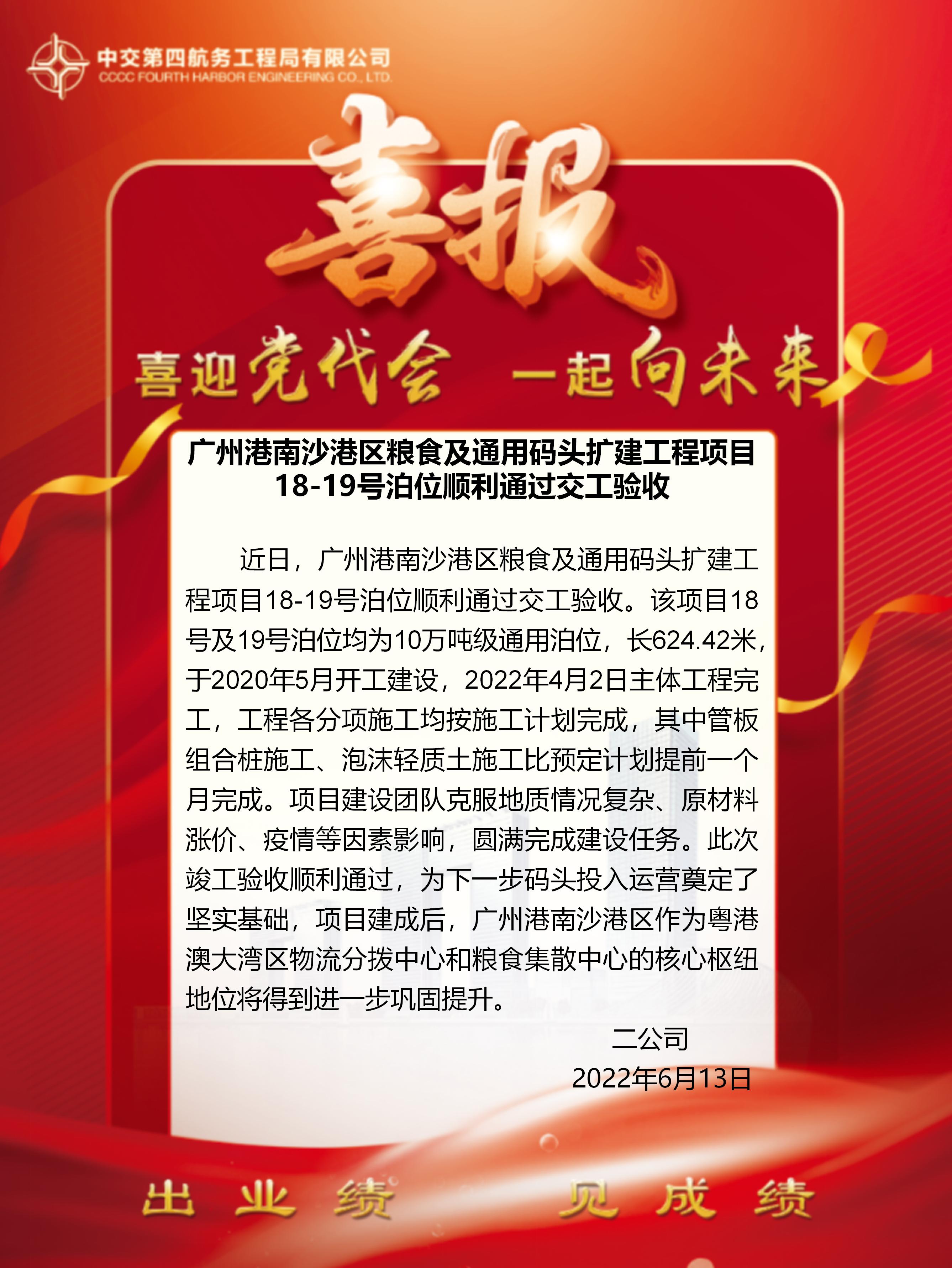 廣州港南沙港區(qū)糧食及通用碼頭擴(kuò)建工程項(xiàng)目18-19號泊位順利通過交工驗(yàn)收