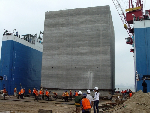 海滄18、19#泊位共有沉箱44件,沉箱長18.13米、寬16.95米、高20米,重2832噸。采用新購的浮船塢出運安裝如此巨型的沉箱,對年輕的福州分公司來說是一次挑戰(zhàn)。分公司成立了由肖俊平副總經(jīng)理擔任總指揮的典型施工指揮協(xié)調(diào)小組,工程部、總工辦、安全管理部、船機部、預制廠聯(lián)合出臺了相關(guān)配套的技術(shù)和安全措施;11月20日在漳州預制廠運用氣囊搬運技術(shù)將沉箱順利移至浮船塢;11月22日晚,大沉箱成功安放到海滄現(xiàn)場預定地點。在大沉箱成功上駁和安放后,分公司領導、相關(guān)部門和預制廠、船機部立即召開施工總結(jié)會。