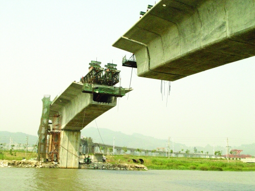 工程部長(zhǎng)楊銳華通過(guò)認(rèn)真分析,提出了解決連續(xù)梁預(yù)制偏差較大,預(yù)應(yīng)力孔道堵塞的有利措施;他還提出把0#塊模板同時(shí)作為濕接縫、邊跨、中跨和合攏段用,大大節(jié)約了資金。他采用膨潤(rùn)土保證泥漿黏度、減少樁錘直徑、導(dǎo)管埋深及樁機(jī)枕木下鋪墊砂包等措施,確保了施工的順利進(jìn)行。連續(xù)梁施工工藝新、難度大,沒(méi)有現(xiàn)成經(jīng)驗(yàn),給測(cè)量工作帶來(lái)很大困難。為了保證連續(xù)梁拼裝的精度準(zhǔn)確,技術(shù)員古付軍每天晚上先用電腦模擬拼裝,不斷探索,尋求突破,較快掌握了技術(shù)。