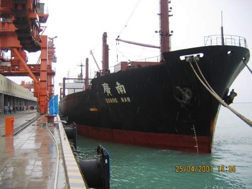 2007年4月25日下午,汕尾紅海灣發(fā)電廠7萬噸煤碼頭迎來了第一艘煤輪--"廣南"。該船靠碼頭上煤的成功,標(biāo)志著汕尾煤碼頭正式投入使用。(林烏殿)