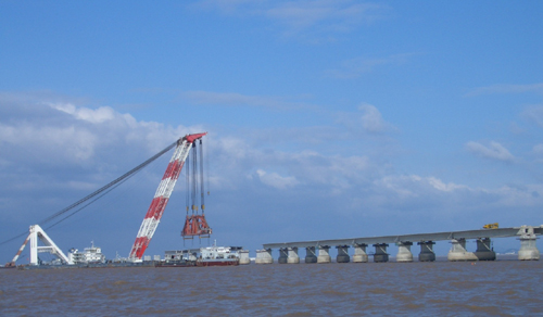 為了誠(chéng)信履約,項(xiàng)目部領(lǐng)導(dǎo)率領(lǐng)全體員工以飽滿(mǎn)的工作熱情投入到施工中去,與一公司的員工通力合作,發(fā)揮團(tuán)隊(duì)作戰(zhàn)的精神,努力克服候潮水作業(yè)、晚間施工等各種困難,安全優(yōu)質(zhì)地完成每一片箱梁的安裝工作,并不斷挖掘安裝潛力,實(shí)現(xiàn)了單日安裝箱梁數(shù)突破4片的目標(biāo),使四船奮進(jìn)船組的日安裝能力進(jìn)一步得到提高。按業(yè)主月計(jì)劃要求5月24日至6月25日要完成G11-G15、G26-G40共36片箱梁安裝的任務(wù),但在全體參與施工的員工的共同努力,于6月17日提前8天完成了月計(jì)劃任務(wù)。