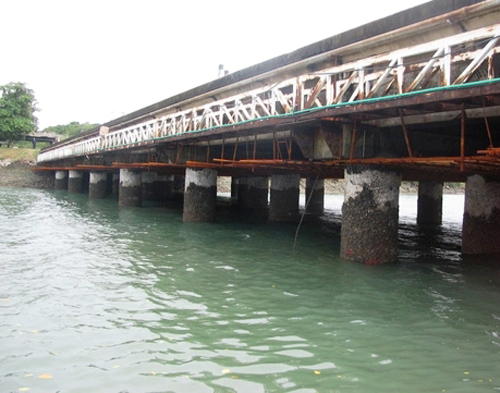肯尼亞蒙巴薩港區(qū)Kipevu橋系一座公路鐵路兩用、高樁梁板式橋梁,長(zhǎng)度97.68米。該橋是連接?xùn)|非第一大港蒙巴薩港和市區(qū)的重要通道,始建于上世紀(jì)60年代,由于使用時(shí)間較長(zhǎng)且負(fù)荷日益超載,橋梁主要結(jié)構(gòu)梁、樁帽、面板等破損非常嚴(yán)重。為保證碼頭安全有效運(yùn)營(yíng),業(yè)主KPA(肯尼亞港務(wù)局)要求對(duì)該橋進(jìn)行全面維修。