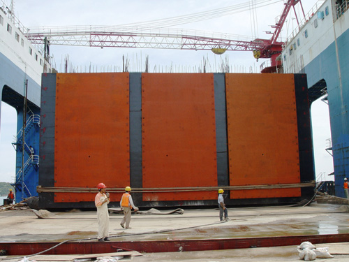 該沉箱于5月6日開始第一層澆筑,主體澆筑6月6日完成,負(fù)責(zé)出運(yùn)、安裝的主要由分公司四航東南號浮船塢完成。8月26日出運(yùn)當(dāng)天,公司工程業(yè)務(wù)部副經(jīng)理陸紅、工藝技術(shù)部鄭遠(yuǎn)斌,分公司副經(jīng)理魏遠(yuǎn)明、肖俊平等到現(xiàn)場作指導(dǎo),并專門召開了專題會議,經(jīng)精心策劃,周密部署,上駁、下潛、出運(yùn)、安裝順利完成,為公司承建大型號沉箱積累了寶貴的施工經(jīng)驗。