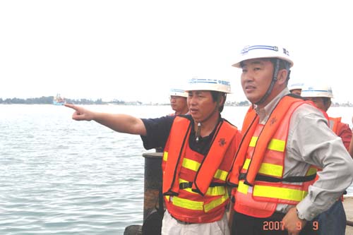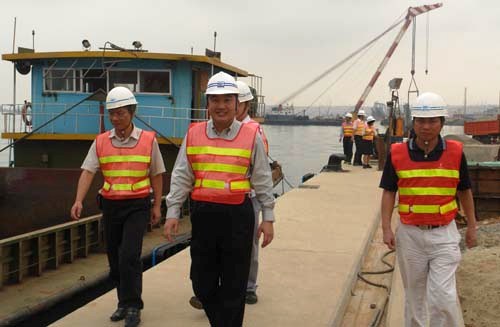 他察看了項(xiàng)目部預(yù)制場(chǎng)、主碼頭及離岸600米的油碼頭施工現(xiàn)場(chǎng),驅(qū)車(chē)到采石場(chǎng),登上多艘大型施工船舶全面了解工程進(jìn)展、石料開(kāi)采運(yùn)輸情況和船容船貌、維修保養(yǎng)和船員生活情況。