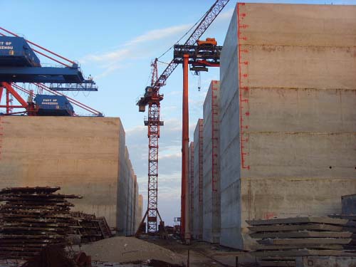 石湖港區(qū)4#泊位碼頭工程采用重力式沉箱結(jié)構(gòu)型式,沉箱預制分項工程自07年4月26日開工,采用分層大模板工藝,歷時5個多月。沉箱數(shù)量共計18件,均為甲型沉箱,混凝土等級為C30,每件沉箱尺寸為長19.4米、寬11.85米、高19.1米,重量為2166噸。