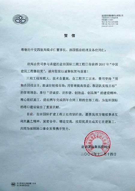 鹽田國際在賀信中充分肯定我局:"自工程開工以來,貴司堅持"用精品回報業(yè)主,靠誠信鏈接市場;用管理提高效益,靠團(tuán)隊實現(xiàn)目標(biāo)"的管理理念,奉行"講誠信、講和諧、創(chuàng)效益、創(chuàng)品牌"的建設(shè)精神,精心組織施工,提前兩年完成四年合同工期的全部工程,為鹽田國際的港口建設(shè)做出了重要貢獻(xiàn)"。賀信說:"鹽田國際擴(kuò)建工程正處于攻堅階段,愿貴我雙方繼續(xù)秉承互利共贏之精神,緊密合作、增進(jìn)交流,按期優(yōu)質(zhì)完成其它在建施工,共同為深圳港口事業(yè)發(fā)展攜手努力"。