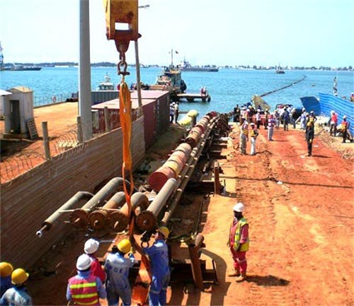 12月20日,羅安達油碼頭工程海底管線成功下水。該管線是由粵工拖33拖輪在海上作為前部牽引,兩臺大型挖機在陸地后方輔助吊送共同完成。