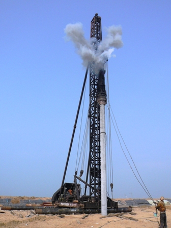 3月23日,??诟鄱诖a頭工程后方吹填區(qū)后軌道梁PHC樁沉樁正式開始。該工程試樁于3月18日通過檢測單位現(xiàn)場試驗,質(zhì)量得到業(yè)主、設(shè)計、監(jiān)理、質(zhì)檢站的一致認(rèn)同,并決定PHC樁的正式施打以試樁標(biāo)準(zhǔn)進行施工。