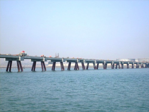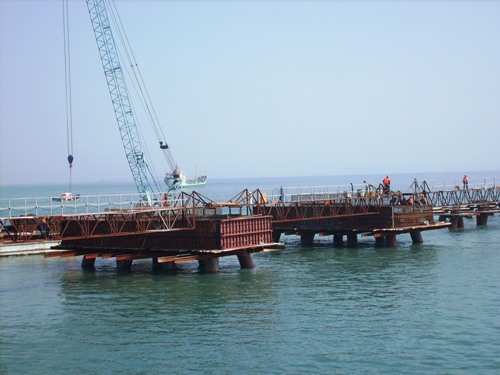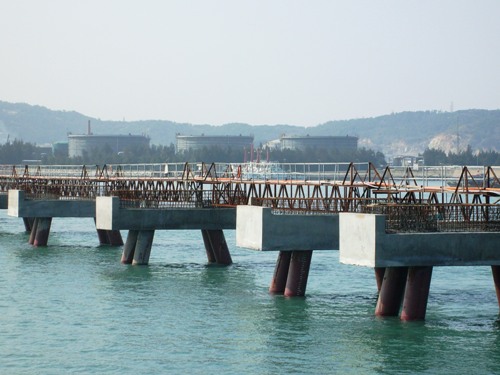 經(jīng)過(guò)項(xiàng)目部員工努力奮戰(zhàn),目前,引橋橋墩已全部澆注完成、引橋預(yù)應(yīng)力空心T字梁板連接510米、可通車(chē)引橋橋面近400米,完成工程總量的65%,大大提高了碼頭主體的施工效率。