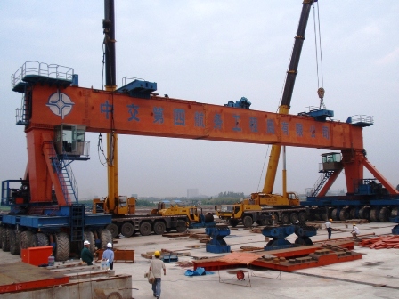 嘉定制梁場(chǎng)大型起重設(shè)備900T搬運(yùn)梁機(jī)也與當(dāng)日完成主體安裝工作。該機(jī)長(zhǎng)45.3米、寬15.5米,主梁重140噸。