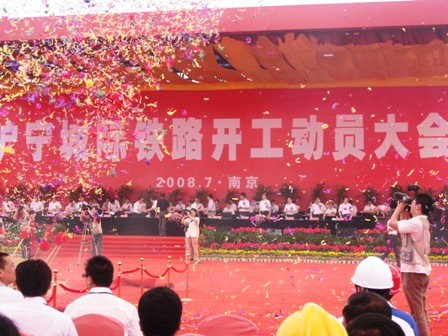 7月1日,滬寧城際鐵路開工動員大會在南京仙林召開,標(biāo)志著備受矚目的滬寧城際鐵路正式開工建設(shè)。大會由江蘇省省長羅志軍主持,中共中央政治局委員、上海市委書記俞正聲宣布工程開工,鐵道部部長劉志軍、江蘇省委書記梁保華、上海市市長韓正分別發(fā)表講話。