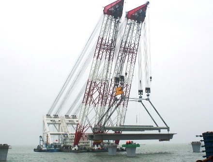 8月18日,青島海灣大橋工程第一片重達(dá)2000噸的60米箱梁安裝成功,標(biāo)志著該工程水上作業(yè)正式開始。