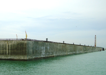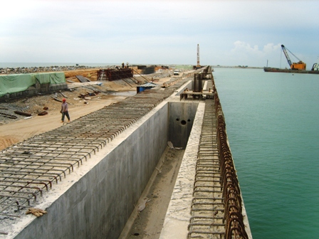 自今年7月19日開始澆筑第一段胸墻以來,該項目部就緊張有序地做好每段胸墻砼澆筑,努力克服八所地區(qū)惡劣季風氣候對施工作業(yè)的影響,克服原材料漲價和供應緊張的影響,見縫插針,積極創(chuàng)造條件。通過項目部的努力拼搏,用不到45天的時間安全高效地完成了17段碼頭胸墻砼共7500立方米的澆筑。