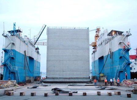 該工程沉箱出運安裝采用"氣囊陸域搬運、半潛駁載運、浮運安裝"工藝組織施工,5月4日開始出運安裝第一批,5月28日完成10件,9月17日開始出運安裝第二批,10月6日完成11件,兩批共完成21件。
