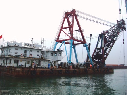 "粵工樁6"船原樁架倒架后高度為52.5米,在沿海港口建設施工中,常常因樁架過高無法進入施工工地。本次技術改造采用人字架為支點,使用4臺滑輪組與兩臺錨機配合將樁架向前倒架,試驗時樁架最高點離水面38米。10月19日,改造后的"粵工樁6"船順利通過湛江海灣大橋(凈空高度48米)到達調順島礦砂碼頭,開始執(zhí)行新的沉樁施工任務。