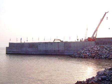 該碼頭工程總長109.5米,裝卸作業(yè)區(qū)寬度50米,碼頭陸域縱深67米,由12個鋼筋混凝土預(yù)制沉箱組成。該工程于2008年3月1日開工,合期工期275天,合同總額約為5980萬元。施工期間,二公司寧德項目部精心組織,克服了礁區(qū)高低不平、潮位變化較大、臺風(fēng)及炸藥進場困難等不利因素影響,有效實現(xiàn)了重件碼頭主體結(jié)構(gòu)的節(jié)點目標(biāo)要求。