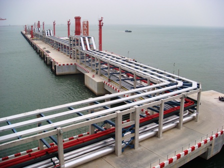 中國石油廣西石化10萬噸級原油碼頭工程位于廣西欽州港鷹嶺作業(yè)區(qū)內(nèi),工程造價為2.78億元,總工期為13個月,工期之緊為華南港工碼頭建設以來之罕有。其建設規(guī)模為2個10萬噸級原油卸船泊位、2個5千噸級和2個3千噸級的成品油卸船泊位。碼頭全長609米,寬36米,整個碼頭呈"L型"布置,碼頭為離岸重力式結構。