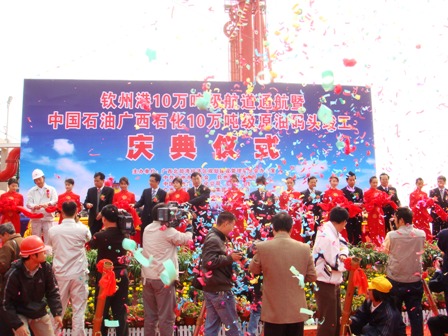 中國石油廣西石化10萬噸級原油碼頭竣工慶典儀式于12月6日在欽州港隆重舉行。廣西壯族自治區(qū)人大副主任覃瑞祥、自治區(qū)副主席陳武、廣西北部灣國際港務集團董事長葉時湘以及欽州市委、市人民政府等領導同志出席了慶典儀式。中石油廣西石化總經(jīng)理吳恩來在慶典致詞上高度贊揚了三公司欽州港項目部攻堅克難并提前32天將碼頭交付使用、為欽州石化項目如期投產(chǎn)奠定了良好的基礎表示感謝!