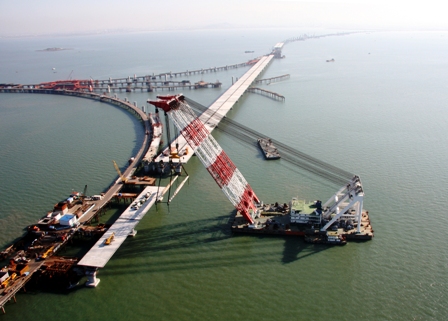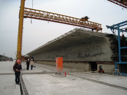 該工程自去年5月24日開工以來,項(xiàng)目部認(rèn)真做好施工組織設(shè)計(jì),精心安排好生產(chǎn),積極開展勞動(dòng)競賽活動(dòng),于今年3月30日按計(jì)劃順利澆筑海灣大橋首片60米箱梁,于8月18日按計(jì)劃成功吊裝第一片箱梁,同時(shí)不斷優(yōu)化施工生產(chǎn)方案,形成了流水化作業(yè):在陸上的梁場,工人完成箱梁澆筑,隨后用橫移小車移放到存梁臺存放;運(yùn)輸時(shí),橫移小車將箱梁橫向移動(dòng)至2臺1200噸提梁機(jī)的軌道上,隨后提梁機(jī)將箱梁吊起、運(yùn)至出運(yùn)碼頭裝上運(yùn)梁駁船;運(yùn)輸?shù)轿缓螅?600噸起重船"四航奮進(jìn)"號精確吊裝。