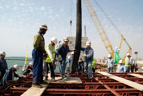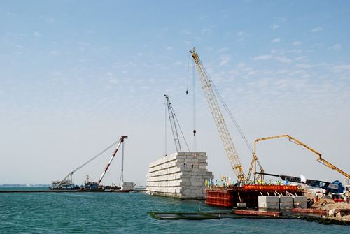 沙特RSGT碼頭工程共需澆筑胸墻71段,砼總量超過4萬立方米。由于胸墻底標(biāo)高低于潮位線,施工受潮水影響很大,為確保水下混凝土澆筑質(zhì)量,胸墻澆筑前,項(xiàng)目部制定質(zhì)量保證措施,進(jìn)行了現(xiàn)場(chǎng)試驗(yàn)并經(jīng)咨工認(rèn)可。胸墻澆筑時(shí),各職能部門安排人員輪流值班,經(jīng)過7個(gè)小時(shí)的連續(xù)施工,第一段胸墻澆筑勝利完成。