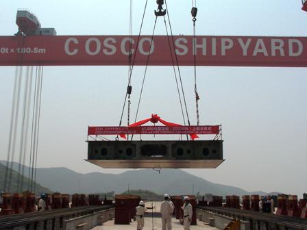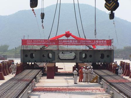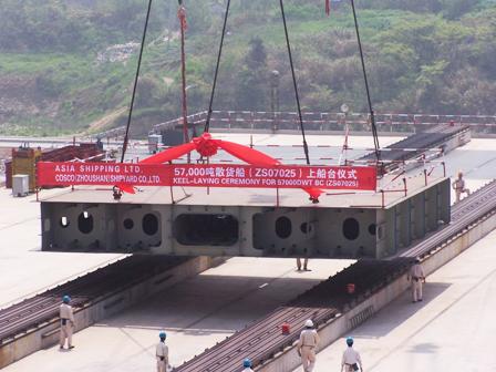 4月15日,隨著首個(gè)造船分段的順利安放,舟山中遠(yuǎn)一號(hào)船臺(tái)正式投入試生產(chǎn)。