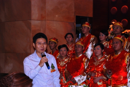 四航局總經(jīng)理孫國強在婚宴祝酒辭,祝愿各位新人新婚幸福、永結同心,工作進步、事業(yè)有成。他指出,青年員工是企業(yè)持續(xù)發(fā)展的重要力量,關心員工的婚姻生活是企業(yè)的一項重要工作,為青年員工舉辦集體婚禮是關心員工的好形式,我們要將青年集體婚禮這類活動辦得越來越好。