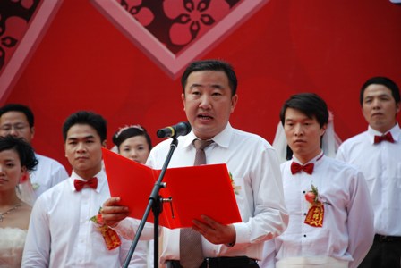 四航局董事長、黨委書記梁卓仁在婚禮上為25對新人主婚并致辭,希望他們在人生的道路上,做一對恩愛夫妻,互敬互愛、相濡以沫、同舟共濟;在工作的征途中,做一對事業(yè)伴侶,相互學習、互相支持、互相勉勵,在各自的崗位上取得優(yōu)異的成績;同時,要尊老愛幼,孝敬父母,做父母的好兒女。