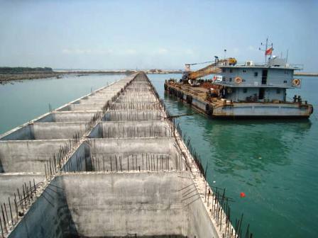 目前,基床整平及第二批沉箱的預制施工正在進行,沉箱內(nèi)回填砂及碼頭后方棱體拋填等施工正在有條不紊地進行。