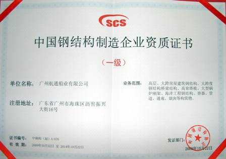 10月22日,廣州航通船業(yè)有限公司榮獲鋼結(jié)構(gòu)制造壹級資質(zhì),日后可承攬的業(yè)務(wù)范圍包括:高層、大跨房屋建筑鋼結(jié)構(gòu)、大跨度鋼結(jié)構(gòu)橋梁結(jié)構(gòu)、高聳塔桅、大型鍋爐剛架、海洋工程鋼結(jié)構(gòu)、容器、管道、通廊、煙囪等構(gòu)筑物。
