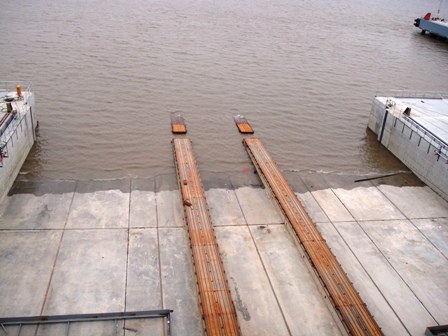 1號(hào)、2號(hào)船臺(tái)工程包括船臺(tái)主體工程、船臺(tái)突堤、陸域吊車道、直立式駁岸和東駁岸架空過渡段等。單個(gè)船臺(tái)主體長(zhǎng)250米,寬45米,水下段長(zhǎng)60米,船臺(tái)滑道坡度1:20;船臺(tái)突堤長(zhǎng)92米,寬21米;陸域吊車道四組。