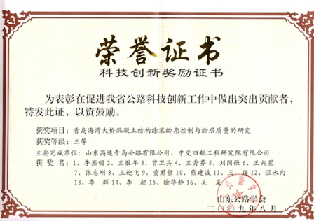 近日,研究院聯(lián)合山東高速青島公路有限公司進(jìn)行的"青島海灣大橋混凝土結(jié)構(gòu)涂裝齡期控制與涂層質(zhì)量的研究"課題獲得"山東公路學(xué)會(huì)科技創(chuàng)新三等獎(jiǎng)"。