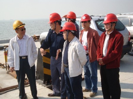 11月4日,廣東省交通廳港航局局長鄧立文、基建副處長韋召文一行到四航局新會基地指導工作。