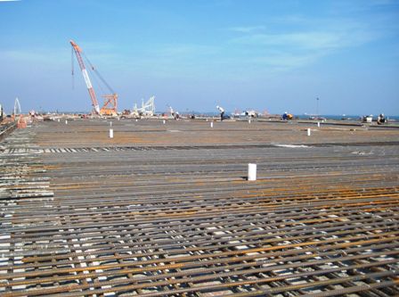該工程為高樁梁板結構,碼頭長度678米,碼頭沉樁基668根,預制安裝構件1454件,現(xiàn)澆混凝土2.9萬方,護岸拋石44萬方,后方回填砂振沖密實78萬方。橫梁部分采用C50高性能混凝土,共80條,單根混凝土方量118方。目前,現(xiàn)澆施工進展順利,樁帽、橫梁已澆注完成,現(xiàn)澆面層及磨耗層施工將全面展開,項目部正搶趕進度,爭取在12月底全面完成混凝土的澆筑任務,完成年度施工計劃。