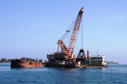 該工程內(nèi)容包含滾裝碼頭基槽及港池挖泥,挖泥斷面層總方量約為97萬方,其中約46萬方的炸礁量,合同工期13個(gè)月。鑒于KBR嚴(yán)格的管理模式,項(xiàng)目部精心籌備前期工作,合理利用有限資源,及時(shí)組織人員設(shè)備進(jìn)場,提前采購炸藥,確保了項(xiàng)目順利開工。
