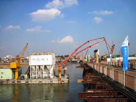 為確保主墩大直徑3.0米水中超長(zhǎng)樁的順利完成,四航貴廣指揮部精心策劃,科學(xué)組織,從人員機(jī)械調(diào)配到典型施工、澆筑現(xiàn)場(chǎng)的有效指揮以及突發(fā)事件的應(yīng)急措施等方面均作了充分準(zhǔn)備。施工中,大橋西主墩受征地阻擾,陸地施工便道無(wú)法拉通,直接影響樁基礎(chǔ)砼的灌筑。在協(xié)調(diào)解決征地問(wèn)題期限不明朗的情況下,四航局權(quán)衡工期、成本等因素,充分配置資源,加大投入,采用水上拌和船("四航砼1")灌筑西主墩樁基礎(chǔ)砼。該船是目前四航局最先進(jìn)的混凝土拌合船,也是國(guó)內(nèi)目前同類(lèi)施工生產(chǎn)能力較強(qiáng)的船舶,混凝土生產(chǎn)能力達(dá)到每小時(shí)200立方米,該船舶的投入,為工程的順利推進(jìn),確保洪水來(lái)臨前主塔出水發(fā)揮了重大作用。