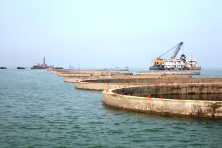 目前,該工程各項(xiàng)施工正有序展開,現(xiàn)已完成基槽開挖337萬立方米、基床拋石57833立方米、圓筒預(yù)制22件。