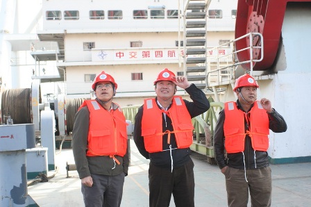 4月7日,四航局董事長(zhǎng)、黨委書(shū)記梁卓仁在二公司副總經(jīng)理歐陽(yáng)麟樺的陪同下,到青島海灣大橋工程施工現(xiàn)場(chǎng)及"四航奮進(jìn)號(hào)"船組指導(dǎo)工作。