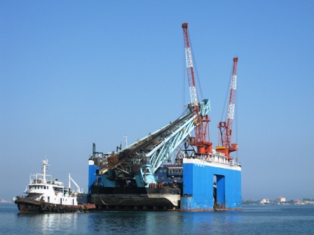 "粵工樁9"船是一艘86米樁架的打樁船,船長64.6米,船寬26.4米,排水量3319噸,是一艘入級船舶。2008年5月經(jīng)過中國船級社檢驗出廠,2009年4月調(diào)遣到安哥拉施工。為保證該船證書的有效性,必須進行塢修。三公司安哥拉船舶部組織有關技術人員、船長等對"粵工樁9"船進塢修理進行專題研究,針對該船長度超出"四航東南"號浮船塢等難點,以及船舶自重、添加設備及材料、壓載水和生活用水等進行計算,采取嚴密的安全措施,使該船順利地進塢修理,為四航局海外自行塢修大型工程船舶積累了難能可貴的經(jīng)驗。