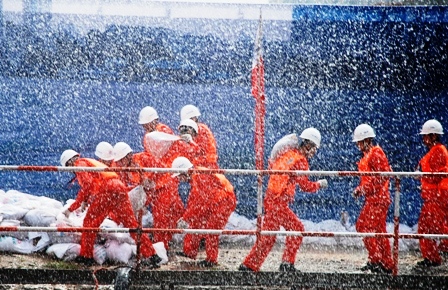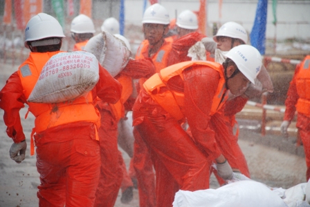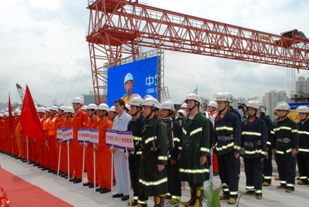 進入6月份以后,臺風、暴雨等惡劣天氣將顯著增多,華南地區(qū)各施工項目將面臨重大考驗。為切實落實"安全第一,預防為主,綜合治理"的方針,實地檢驗處理突發(fā)事件的能力,6月20日,中交股份在中交四航局承建的廣州市洲頭咀隧道進行了一場大型的防臺風、防坍塌實景模擬大型演練。國務院國資委綜合局副局長劉源、國家安監(jiān)總局監(jiān)管二司副司長王力爭、住房和城鄉(xiāng)建設部工程質(zhì)量安全監(jiān)管司副司長王樹平、國家應急救援指揮中心協(xié)調(diào)部副主任胡學義、廣州市人民政府副秘書長張火青、中國交通建設股份有限公司副總裁侯金龍、中交四航局總經(jīng)理孫國強等領導出席此次演練活動。