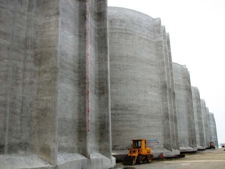 該工程共需預(yù)制圓筒90件,其中前3個澆筑的巨型圓筒外徑21.0米,筒高22.5米,單段筒寬21.95米,重2600噸,為當(dāng)時國內(nèi)體積最大最高的圓筒之一。該工程自2009年11月開工以來,項目部統(tǒng)籌調(diào)配資源,合理推進施工,認(rèn)真做好工藝銜接,努力加快預(yù)制進度,確保了圓筒預(yù)制順利完工。