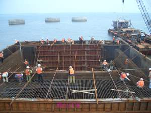 十多年來,中港四航局建設(shè)者們穩(wěn)扎廣西水工市場(chǎng),誠(chéng)信經(jīng)營(yíng)、精心施工,以優(yōu)良的質(zhì)量承建了防城港幾乎所有的大型碼頭共13座。這次四航局三公司承建的防城港20萬噸級(jí)過駁碼頭平臺(tái),不但工期緊、施工技術(shù)要求高、難度大,而且由于外海作業(yè),風(fēng)高浪急,施工環(huán)境和條件非常艱苦。但勤勞勇敢的四航人勇于創(chuàng)造國(guó)內(nèi)港口建設(shè)最大圓筒施工新紀(jì)錄,敢于發(fā)揚(yáng)"四海為家、開拓為志,信譽(yù)為上、團(tuán)結(jié)為本"的四航精神,不斷戰(zhàn)勝困難,在祖國(guó)西南海疆的北部灣再一次奏響了四航人筑港的英雄樂章,為廣西、為華南港口建設(shè)打了一個(gè)漂亮的攻堅(jiān)戰(zhàn)。