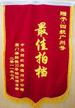 近日,福州分公司招銀10號泊位碼頭工程項目部把一面繡著“四航廣州號——最佳拍檔”的錦旗送達三公司,并轉(zhuǎn)達了該工程業(yè)主、監(jiān)理、項目部對“四航廣州”號高效施工的贊揚與謝意。