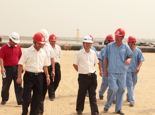 在干散貨碼頭項目施工現(xiàn)場,孫國強一行聽取了施工進展情況的匯報,并對項目建設(shè)情況表示滿意。他要求項目部繼續(xù)發(fā)揚團結(jié)奮進、頑強拼搏的良好作風,加強全面管控力度,科學規(guī)劃組織,加快施工進度,同時做好高溫天氣下的防暑降溫工作。