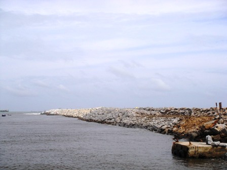 該項(xiàng)目西防波堤施工初期一直處于邊設(shè)計(jì)、邊修改、邊施工的狀態(tài),直至2010年7月26日,項(xiàng)目部才正式收到西堤最終版施工圖紙。隨后,項(xiàng)目部加強(qiáng)各工區(qū)人員的組織協(xié)調(diào),合理開展水上、陸上石料運(yùn)輸?shù)裙ぷ?,期間克服了業(yè)主資金不到位、尼日利亞總統(tǒng)大選政治影響、當(dāng)?shù)刂伟残蝿輴夯?、遭遇特大的天文大潮等困難,邊施工邊想方設(shè)法規(guī)避資金、安全風(fēng)險,全面鋪開西堤施工。