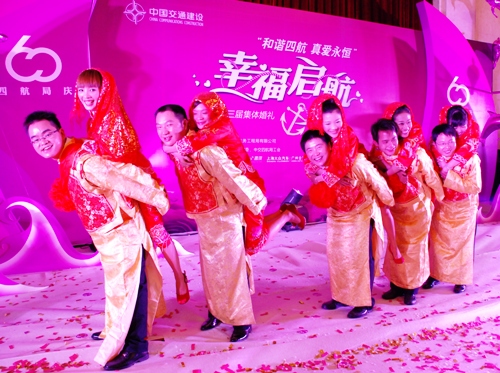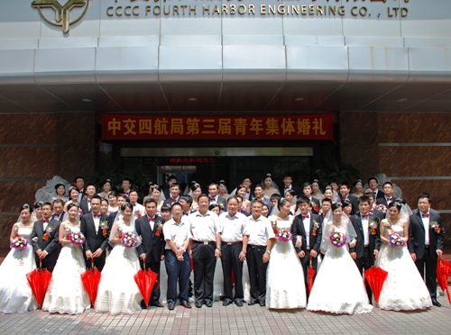 近年來,中交四航局每年招收應(yīng)屆畢業(yè)生300多人,現(xiàn)有員工近6000人,其中35歲以下青年3252人,年輕人已成為了企業(yè)的中堅(jiān)力量。四航局黨委堅(jiān)持以人為本,推進(jìn)和諧四航建設(shè),并積極探索黨建帶團(tuán)建有效途徑,先后榮獲“全國先進(jìn)基層黨組織”和“中央企業(yè)黨建帶團(tuán)建工作先進(jìn)單位”。因?yàn)榻ㄖこ唐髽I(yè)工作特點(diǎn),來到中交四航局的年輕人剛剛從學(xué)校畢業(yè)便走到了施工一線,他們每天面對(duì)的是圖紙、機(jī)械、挑燈夜戰(zhàn),正因?yàn)橛辛怂麄?,企業(yè)煥發(fā)著生機(jī)和活力。為增強(qiáng)青年員工的凝聚力,體現(xiàn)和諧四航理念,四航局結(jié)合施工企業(yè)工作特點(diǎn),從2007年開始,局團(tuán)委每?jī)赡瓴邉澖M織一屆以“和諧四航,真愛永恒”為主題的青年集體婚禮活動(dòng),至今年為止,共舉辦了三屆。集體婚禮的成功舉辦,體現(xiàn)了四航局對(duì)青年員工的關(guān)愛之情,增強(qiáng)了青年員工對(duì)企業(yè)的歸屬感和忠誠度。