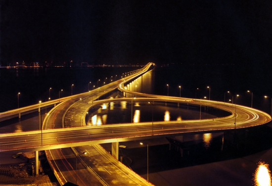 澳門"友誼大橋",工程原稱新澳凼大橋,為連接澳門半島和凼仔島的跨海公路大橋。1990年交通部四航局澳門振華海灣工程有限公司中標(biāo),四航局組建項(xiàng)目部負(fù)責(zé)施工。1990年4月開工,1993年12月竣工。大橋主橋長4414米,匝道橋長1108米,主橋面寬19米,雙向4車道。大橋結(jié)構(gòu)是:主跨為鉆孔灌注樁基礎(chǔ)、預(yù)制安裝工字塊橋墩及縱橫梁、橋面現(xiàn)澆瀝青混凝土。大橋主橋全部位于波濤洶涌的大海上,雄偉壯觀,儼若游龍,伸向海灣彼岸,是澳門地區(qū)一條亮麗的風(fēng)景線,成為中葡友誼的象征。1994年,交通部部長黃鎮(zhèn)東在通車前由澳門總督韋奇立陪同視察了大橋。4月17日,葡萄牙總理席瓦為大橋剪彩,將大橋命名為"友誼大橋"。大橋的建成,對澳門的經(jīng)濟(jì)發(fā)展和繁榮穩(wěn)定起到了重要作用,對實(shí)現(xiàn)"一國兩制"具有重要的政治意義。澳門總督韋奇立評價,"如果說新大橋建成能改善交通條件,方便居民活動和有利於本澳的空間組織,具有物質(zhì)和戰(zhàn)略上的重要性,那么其象征作用和意義不在前者之下。新大橋?yàn)榘拈T而建,它是葡萄牙人和華人的杰作,是共同的愿望和同心協(xié)力的結(jié)晶,是葡萄牙和中華人民共和國目標(biāo)一致、協(xié)調(diào)努力的成果。"大橋的建成也顯示了我局雄厚的施工實(shí)力和豐富的施工經(jīng)驗(yàn),為四航局進(jìn)一步躋身于國際建筑市場的競爭積累了經(jīng)驗(yàn)。