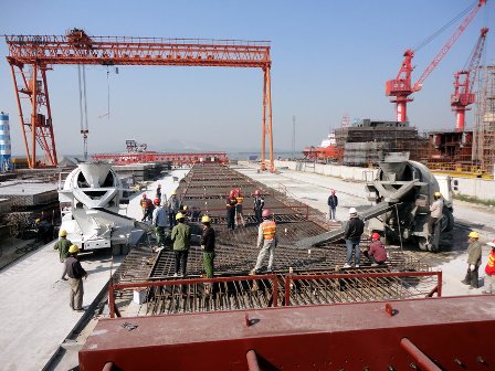 此預(yù)應(yīng)力板線投產(chǎn)是繼2條1500噸預(yù)應(yīng)力梁生產(chǎn)線后的又一條超大預(yù)應(yīng)力生產(chǎn)線投產(chǎn)。此預(yù)應(yīng)力張拉臺座由樁基基礎(chǔ)、壓柱、橫向連續(xù)梁、底板、端部重力墩、牛腿、鋼梁結(jié)構(gòu)及張拉系統(tǒng)構(gòu)成。張拉臺座長158米,寬7.6米,本條生產(chǎn)線一次張拉可生產(chǎn)13~15件實心面板或空心板,最大張拉力可達1200噸,屬目前國內(nèi)最大張拉力的預(yù)應(yīng)力板線。